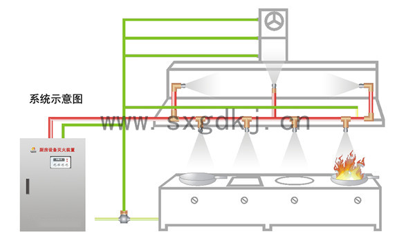 4、装置启动在灭灶台火的同时把厨房专用灭火药剂喷向排烟系统,同一时间切断燃气或燃油供应,药剂喷洒完毕水流阀自动开启,自来水喷洒到灶具及烟道内使其降温确保不复燃。