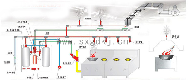 4、装置启动在灭灶台火的同时把厨房专用灭火药剂喷向排烟系统,同一时间切断燃气或燃油供应,药剂喷洒完毕水流阀自动开启,自来水喷洒到灶具及烟道内使其降温确保不复燃。