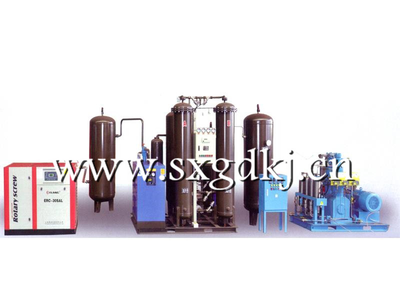 空气中的主要成分是氮和氧,利用环境温度下,空气中氮气和氧气在沸石分子筛(ZMS)上的吸附性能不同(氧气能通过而氮气被吸附),设计适当的工艺过程,而使氮和氧分离制得氧气。氮气在沸石子筛上的吸附能力比氧气强(氮与分子筛表面离子的作用力强),当空气在加压状态下通过装有沸石分子筛吸附剂的吸附床时,氮气被分子筛吸附,氧气因吸附较少,在气相中得到富集并流出吸附床,使氧气和氮气分离获得氧气。当分子筛吸附氮气至接近饱和后,停止通空气并降低吸附床的压力,分子筛吸附的氮气便可以解吸出来,分子筛得到再生并可重复利用。两个以上的吸附床轮流切换工作,便可连续生产出氧气。
